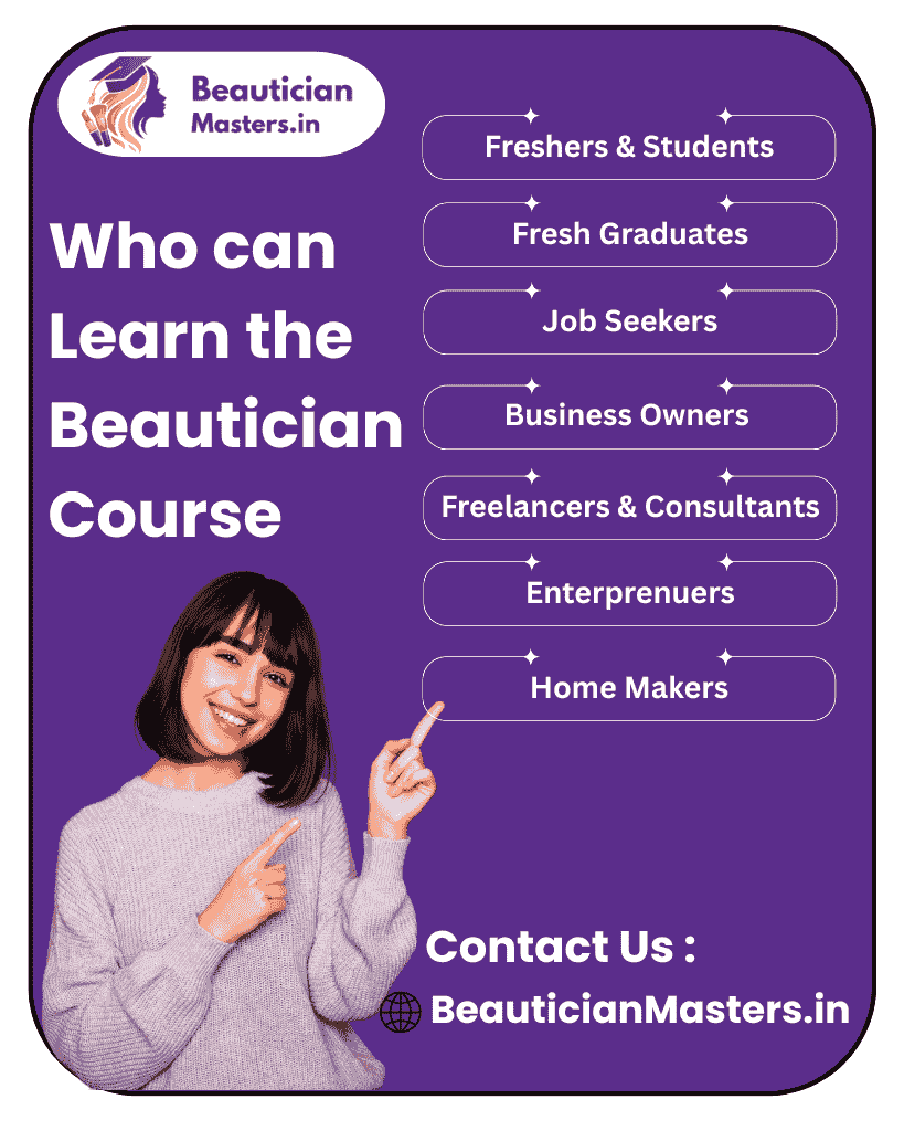 - Freshers & Students – Students and fresh learners can easily start a beautician course. The training begins from basic level, so no prior knowledge is required. This is ideal for young learners who want to build a career in beauty industry early.
